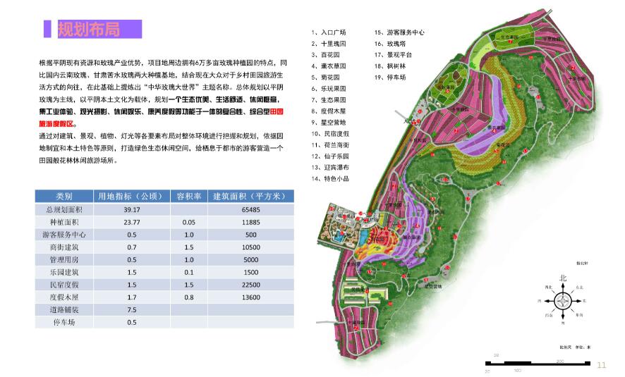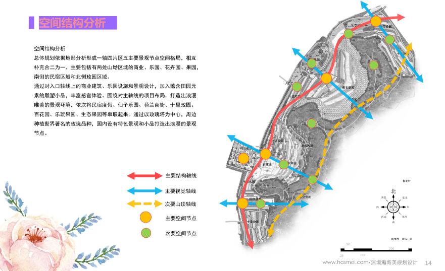 總體規劃依據地形分析形成一軸四片區五主要景觀節點空間格局,相互補充合二為一。主要包括有兩處山坳區域的商業、樂園、花卉園、果園,南側的民宿區域和北側玫園區域。