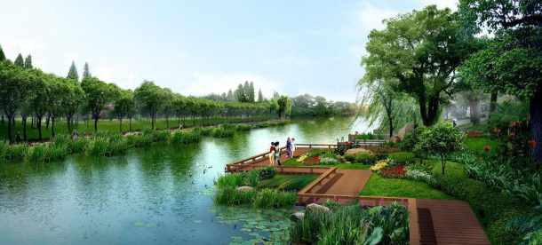 ● 以自然式手法打造景觀岸線,結合親水平臺、木質廊道等營造生態(tài)和諧的濱水景觀。