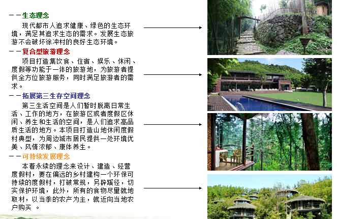 依托于大別山自然和地質景觀,結合地方歷史文化,凸顯六安“綠色”、“藍色”和“特色”旅游產品概念,以高端人群為目標市場,打造出以“野”和“奢”為核心,大隱隱于山的低調奢華的高端生態度假村,滿足高端人群對歸隱田趣生活模式的需求。